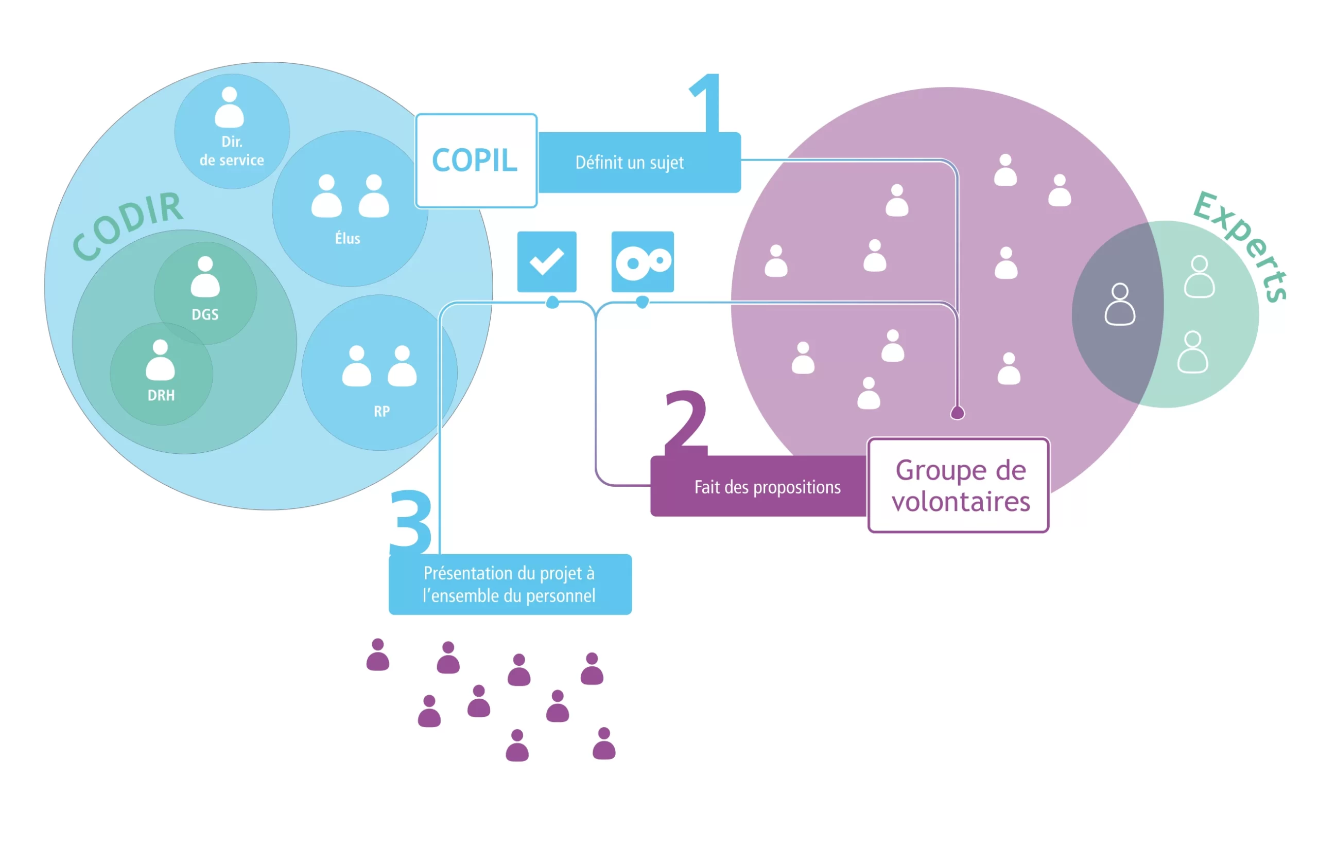 Ces groupes de travail sont des espaces de collaboration entre direction et agents pour enrichir des projets préétablis, animés par des cadres ou des prestataires extérieurs et des règles de fonctionnement coopératives. Ils abordent divers sujets, notamment RH et sécurité au travail. Les participants formulent des recommandations examinées par les élus. L’efficacité réside dans le cadre prédéfini, prévenant les «hors-sujets». Comme par exemples : l’aménagement des horaires, la gestion de l’alcool au travail, la politique RH…