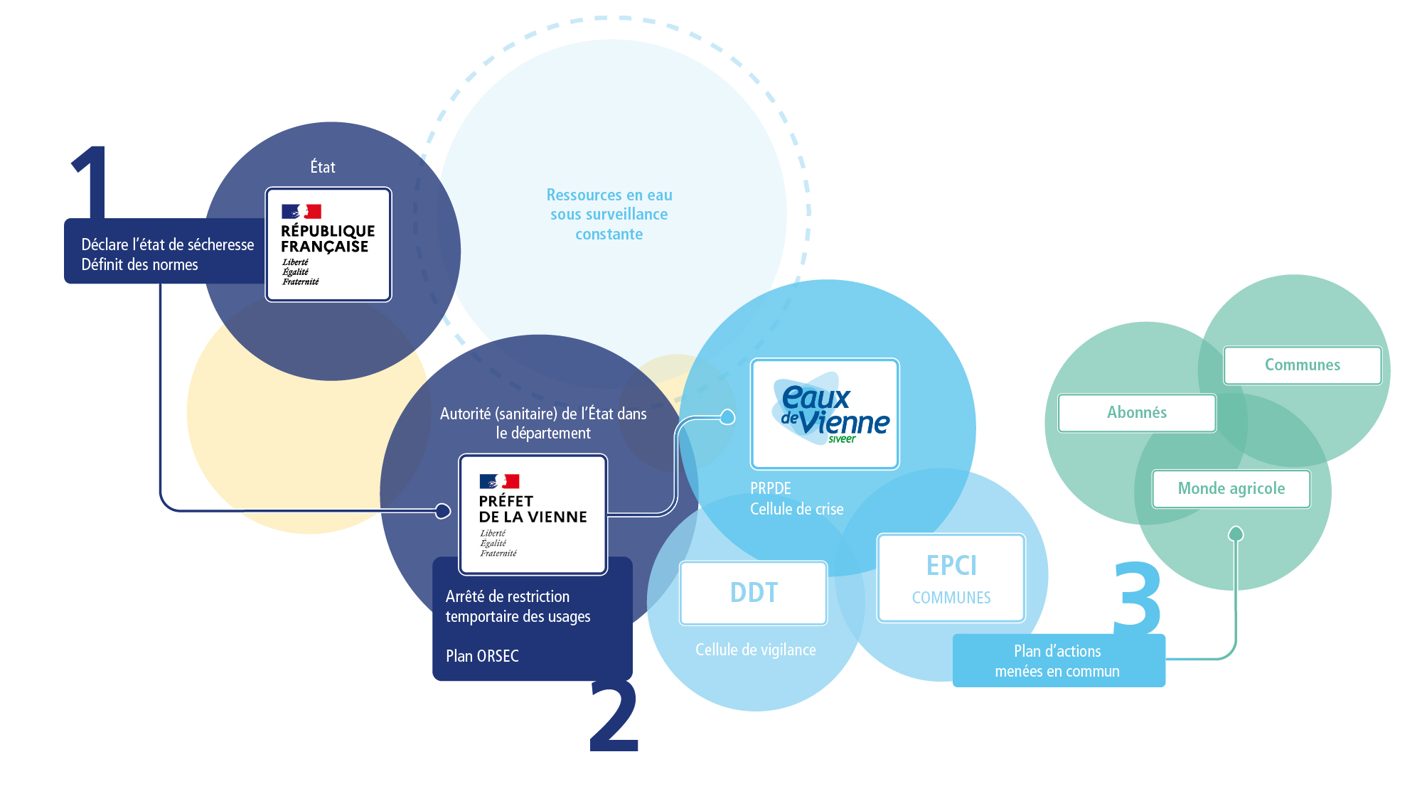 Depuis le début du mandat, nous sommes confrontés en permanence à des situations de tension et en particulier à la gestion de la ressource “eau”. Au-delà des cellules de crise qui gèrent des situations conjoncturelles (comme celles des THM et du chlorothalonil), le Syndicat s’est inscrit dans la démarche nationale de réduction de 10 % des prélèvements et de consommation d’eau ; un effort collectif demandé à tous les acteurs économiques, des abonnés aux industriels. Nous réfléchissons, en concertation avec nos partenaires (Préfecture, Grand Poitiers, Syndicats de Rivières, DDT, ARS…), à une stratégie de gestion structurelle pour faire face, dans le long terme, aux pénuries d’eau. Nous sommes aujourd’hui aux prémices de ces réflexions qui devront répondre à la question “Quelle ressource, quantitative et qualitative, sera disponible dans les 20 ans à venir ?” Tous les scénarios possibles de crise de l’eau sont envisagés, les conséquences anticipées et évaluées, des solutions et actions sont élaborées… Là encore, nous travaillons avec nos partenaires locaux et nationaux. La définition et la mise en œuvre de cette stratégie ont demandé du temps. Un défi pour la seconde partie du mandat.